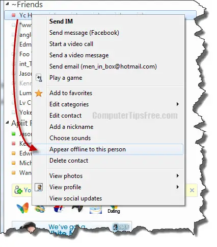 2 বৈশিষ্ট্যটি সরানো হয়েছে। পরিচিতিকে ডান ক্লিক করুন এবং তারপরে "এই ব্যক্তির কাছে অফলাইনে উপস্থিত হন" ব্যবহার করুন। Http://www.computertipsfree.com/how-to- block- contact- in- windows- live-mes यात्रा -2011/ থেকে চিত্র — BloodPhilia সূত্র এত সুন্দর লাল রেখা! আপনি এগুলি কিভাবে তৈরি করবেন? — studiohack @ স্টুডিওহাক টেকস্মিথের স্নাগিট যা আমি সর্বদা ব্যবহার করি। তবে এই চিত্রটি আমার দ্বারা নেওয়া হয়নি কারণ আমার কাছে কেবল ডাচ ভাষায় লাইভ মেসেঞ্জার রয়েছে। — ব্লাডফিলিয়া